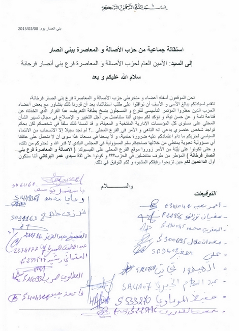 واعلن الاعضاء المستقيلين استعدادهم لدعم الأمين المحلي لفرع الحزب ببني انصار في حالة ما أقدم على طرد من وصفوه بـ"المشبوه".