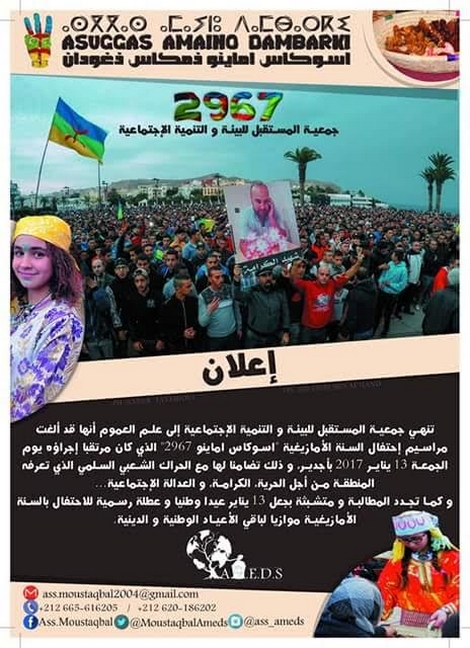 قررت ﺟﻤﻌﻴﺔ ﺍﻟﻤﺴﺘﻘﺒﻞ ﻟﻠﺒﻴﺌﺔ ﻭ ﺍﻟﺘﻨﻤﻴﺔ ﺍﻹﺟﺘﻤﺎﻋﻴﺔ الغاء ﻣﺮﺍﺳﻴﻢ ﺇﺣﺘﻔﺎﻝ ﺍﻟﺴﻨﺔ ﺍﻷﻣﺎﺯﻳﻐﻴﺔ " ﺍﺳﻮﻛﺎﺱ ﺍﻣﺎﻳﻨﻮ "2967 ﺍﻟذي ﻛﺎﻥ ﻣﺮﺗﻘﺒﺎ تنظيمه ﻳﻮﻡ ﺍﻟﺠﻤﻌﺔ 13 ﻳﻨﺎﻳﺮ 2017 ﺑﺄﺟدﻳﺮ.