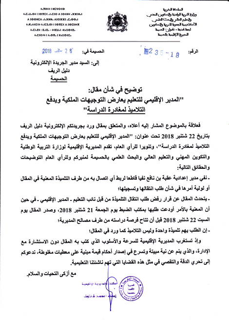 توصلت شبكة دليل الريف بتوضيح من المديرية الاقليمية للتربية والتكوين بالحسيمة، ردا على المقال المنشور بالجريدة يوم السبت الماضي تحت عنوان "المدير الاقليمي للتعليم يعارض التوجهات الملكية ويدفع التلاميذ لمغادرة الدراسة"، تفني فيه وجود اي قرار من المدير الاقليمي يمنع انتقال التلاميذ من اعدادية تفروين بجماعة تفروين الى اعدادية عقبة بن نافع ببني بوعياش.