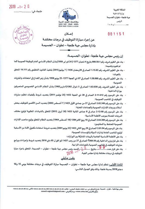 أعلن مجلس جهة طنجة تطوان الحسيمة، عن إجراء مباراة للتوظيف في 54 منصباً، موزعة على درجات مختلفة، وذلك يومي 15 و 16 دجنبر المقبل.