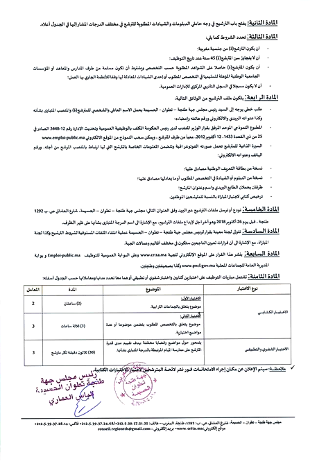 وحدد إعلان المباراة يوم 27 أكتوبر كآخر اجل لايداع ملفات الترشيح، على أن تجرى الإختبارات الكتابية للمباراة يومي 15 و 16 دجنبر، تليها إختبارات شفوية أو تطبيقية بعد جرد لائحة الناجحين في المرحلة الأولى.