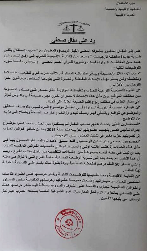 وجاء هذا في بلاغ توضيحي ردا على المقال المنشور بموقع "دليل الريف" تحت عنوان " حزب الاستقلال يتلقى ضربة جديدة بمنطقة تارجيست "، والذي تطرق لاستقالة كاتب الفرع المحلي للحزب بتارجيست.