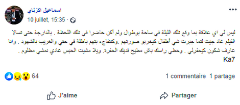 من جهته ينكر اكزناي هذه التهم، حيث كتب على صفحته بموقع التواصل الاجتماعي فيسبوك قبل اعتقاله "ليس لي اي علاقة بما وقع تلك الليلة في ساحة بوطوال ولم أكن حاضرا في تلك اللحظة. بالدارجة حتى تسالا الفيلم عاد جيت لتما جبرت شي أطفال كيخربو صورتهم .وكنتفاجء بتهم باطلة في حقي والغريب بالشهود . وانا عارف شكون كيحفرلي . وحظي راسك باش مطيح فديك الحفرة. ويلا مشيت الحبس غادي نمشي مظلوم".