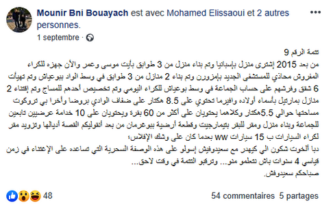 واتهم المستشار رئيس المجلس بالاغتناء منذ انتحابه رئيسا وقال في تدوينة على صفتحته بموقع التواصل الاجتماعي "من بعد 2015 إشترى منزل بإسبانيا وتم بناء منزل من 3 طوابق بأيت موسى وعمر والأن جهزه للكراء المفروش محاذي للمستشفى الجديد بإمزورن وتم بناء 2 منازل من 3 طوابق في وسط الواد ببوعياش وتم تهيأت 6 شقق وفرشهم على حساب الجماعة في وسط بوعياش للكراء اليومي وتم تخصيص أحدهم للمساج وتم إقتناء 2 منازل بمارتيل بأسماء أولاده وافيرما تحتوي على 8.5 هكتار على ضفاف الوادي بروضا وأخرا بي تروكوت مساحتها حوالي 5.5هكتار وكلاهما يحتويان على أكثر من 60 بقرة ويحتويان على 10 خدامة عرضيين تابعين للجماعة وبناء منزل ومقر للبقر بتيمارجيت وقطعة أرضية ببوغرمان من بعد أنقوليكم القصة أديالها وتزويد مقر لكراء السيارات ب 15 سيارات ww بعدما كان على وشك الإفلاس.. دبا ألخوت شكون الي كيهدر مع سعيدوفيش إسولو على هذه الوصفة السحرية التي تساعده على الإغتناء في زمن قياسي 4 سنوات باش نتعلمو منو... وترقبو التتمة في وقت لاحق... صباحكم سعيدوفش".