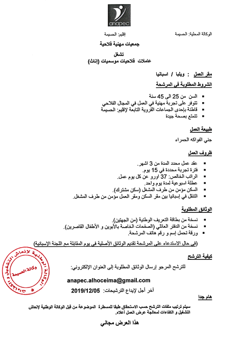 أعلنت والوكالة الوطنية للكفاءات وانعاش الشغل، عن فتح باب التسجيل امام النساء القرويات باقليم الحسيمة، الراغبات في العمل بمزارع الفواكه الحمراء في اسبانيا.