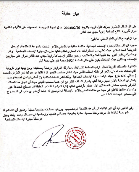 على اثر المقال المنشور بجريدة "دليل الريف" حول واقعة نقل سيدة مرضية على لوح خشبي بدوار كنوريا التابع لجماعة زاوية سيدي عبد القادر باقليم الحسيمة، توصلت الجريدة "ببيان حقيقة" من رئيس الجماعة اوضح فيه حيثيات هذه الواقعة.