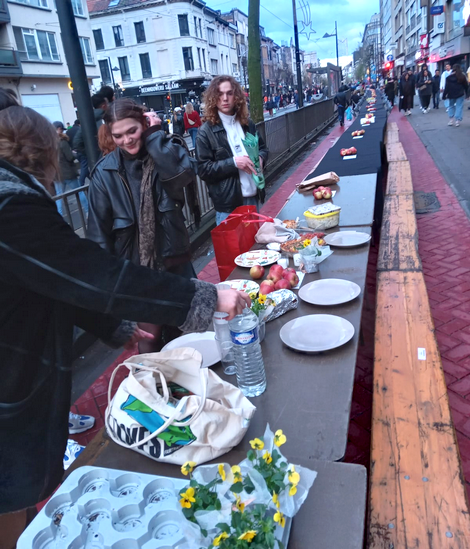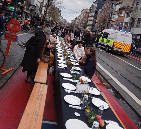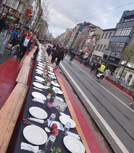 مائدة الإفطار الجماعي امتدت لشارعين جمعت جميع الأديان من مسلمين ومسيحيين ويهود، بين مهاجرين وأوروبيين في المدينة البلجيكية.