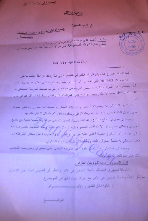 واوضح السيد شهيد عدي في شكايته المقدمة للوكيل العام والتي حصلت شبكة دليل الريف على نسخة منها انه بتاريخ 19 مارس من الشهر الجاري القي القبض على صهره المسمى بلحاج مستمع من متجر للمواد الغذائية ببني بوعياش من طرف الضابط المشتكى به وان الاخير اذاقه عذابا لا يطاق وارغمه على الاعتراف بارتكاب جريمة سرقة رغم انه لم يسبق له ان قام بهذا العمل حسب الشكاية .