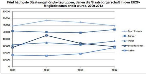 وكشف الوكالة الأوروبية للإحصائيات في تقريرها الأخير حول الجنسيات أن 818 ألف شخص في مجموع دول أوروبا قد حصلوا على الجنسية في الاتحاد الأوروبي سنة 2012، وتتفاوت نسبة الحصول من بلد الى آخر بسبب غياب قانون أوروبي يوحد منح الجنسية للأجانب.