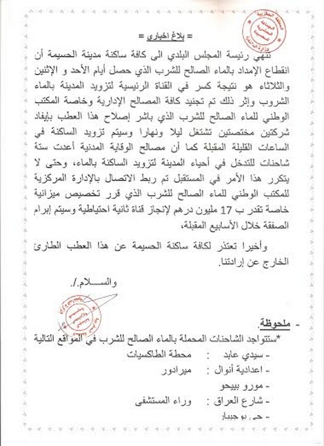 وأشارت رئيسة المجلس انه ولتفادي تكرار هذا الامر تم ربط الاتصال بالادارة المركزية للمكتب الوطني للماء الصالح للشرب الذي خصص ميزانية خاصة تقدر بـ 17 مليون درهم لانجاز قناة ثانية احتياطية وسيتم ابرام الصفقة الخاصة بها خلال الاسابيع المقبلة.