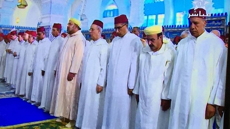 العماري ظهر إلى جانب الملك، الذي كان مرفوقا بوزير الأوقاف والشؤون الإسلامية، أحمد التوفيق، مرتديا لباسا تقليديا عبارة عن جلابة وعمامة مغربية وهو يستمع لخطبة إمام المسجد.