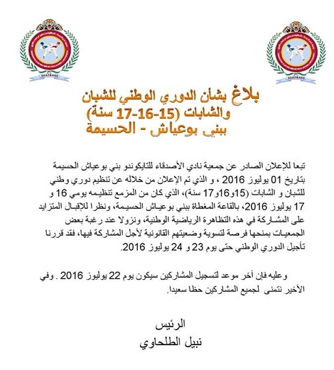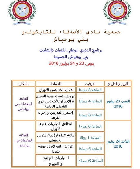 اعلنت جمعية نادي الأصدقاء للتايكوندو بني بوعياش عن تاجيل الدوري الوطني في رياضة "التكواندو" الذي كان مقررا يومي 16 و 17 يوليوز بالقاعة المغطاة ببني بوعياش، وذلك الى غاية يومي 23 و 24 من الشهر نفسه.