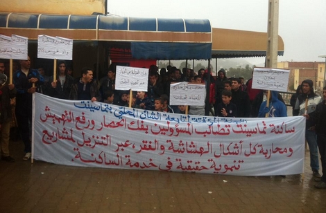 ورفع المتظاهرون خلال هذه الوقفة تحت زخات المطر شعارات تُطالب بـ"فك الحصار ورفع التهميش ومحاربة كل أشكال الهشاشة بالمنطقة"، مُذكرين بالوعود التي سبق ان مُنحت لهم من لدن المسؤولين الاقليميين، إبان الاحتجاجت التي تلت حادثة وفاة إمرأة بالبلدة بعد أن إمتنعت المصالح المحلية عن توفير سيارة إسعاف لنقلها صوب المستشفى.