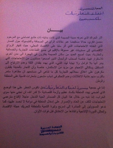 البيان ذاته تحدث عن استياء أصحاب الرأسمال من الاحتجاجات، مما يهدّد بفقدان الثقة وعدم الارتياح الى المستقبل والتالي الإحجام عن مزيد من الاستثمار، حسب البيان الذي أشار كذلك إلى أن التجار بالمدينة يقبلون مكرهون على إغلاق محلاتهم التجارية، خشية الانفلاتات وعدم التحكم في شباب مشحون بشعارات قاسية على المنطقة والوطن، وقف تعبير البيان.