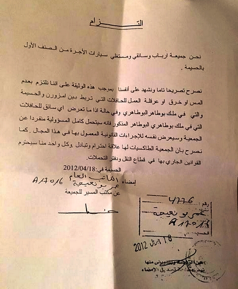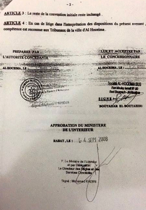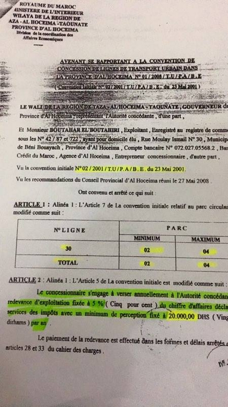ونفى مالك الحافلات ما يدعيه سائقي سيارات الاجرة، من انه لا يتوفر على رخصة لاستغلال أربع حافلات في هذا الخط، مشيرا إلى ان الرخصة الممنوحة له من طرف الجهات المعنية، تمنحه الحق في استغلال أسطول من أربع حافلات (الوثيقة)، واضاف ان جمعية أرباب وسائقي سيارات الأجرة من الصنف الاول بالحسيمة، كانت قد التزمت في شخص رئيسها سنة 2012 بعدم عرقلة عمل حافلاته، الا أنها لم تفي بالتزامها حسب قوله (الوثيقة).