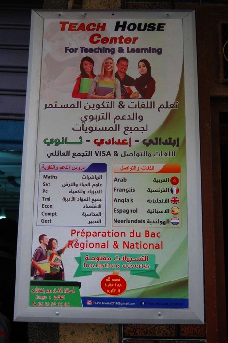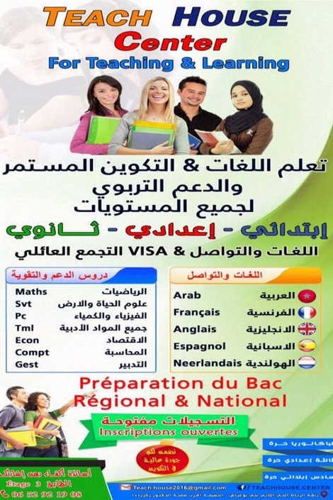 وإضافة إلى ذلك يقدم مركز "Teach Hous" خدمات الدعم التربوي لفائدة تلاميذ في جميع مستوياتهم، تشمل كل من الرياضيات وعلوم الحياة والأرض والفيزياء والكيمياء والاقتصاد والمحاسبة والتدبير وجميع المواد الأدبية، وذلت تحت إشراف أساتذة متخصصين يُشهد لهم بالكفاءة.