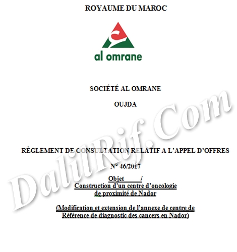 وحسب وثيقة الاعلان عن الصفقة التي تتوفر دليل الريف على نسخة منها، فان هذا المشروع ، ستمويل من شركة العمران في وجدة، بتكلفة مالية تقدر بمليار و282 مليون سنتيم، وستفتح الاظرفة الصفقة في 5 من شهر ابريل المقبل.