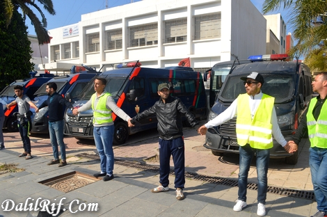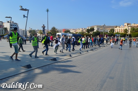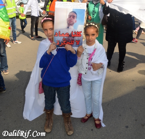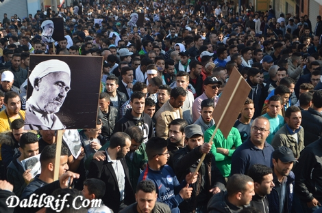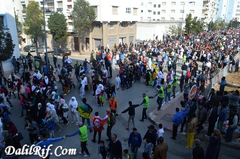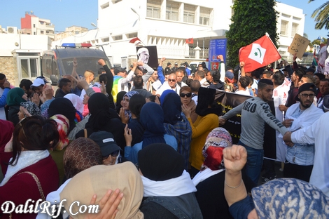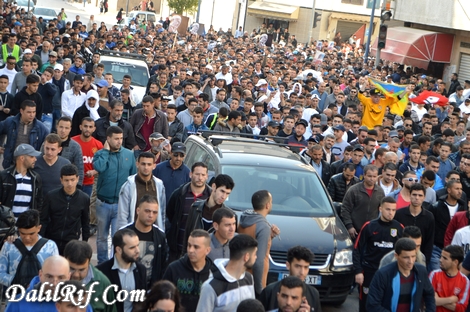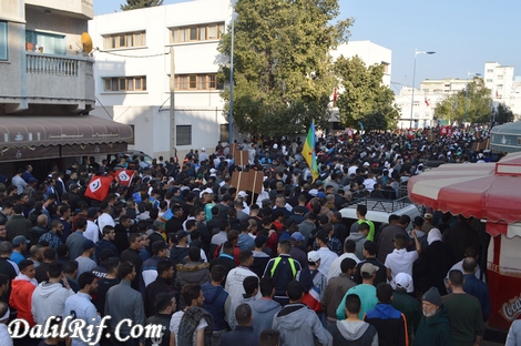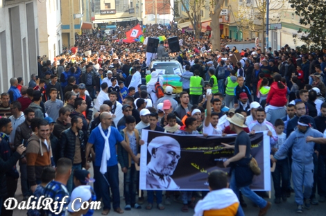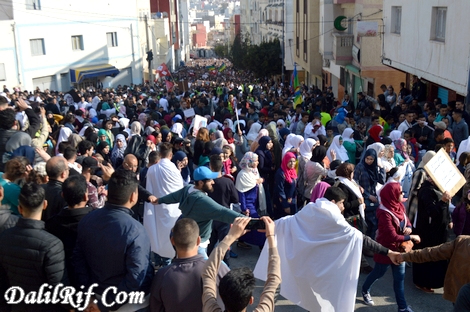 المسيرة انطلت من شارع محمد ابن عبد الكريم الخطابي وسط مدينة الحسيمة، بمُقدّمة نسائية مؤثّثة ببياض الأكفان، لتجوب عدد من الأحياء، بعد ان توقّفت للحظات أمام المقر الاقليمي للأمن الوطني، الذي كان مُحاط بترسانة أمنية مكثّفة، حيث رفع المحتجون هناك شعارات ضد "العسكرة" كما أطلقوا النار على أحد المسؤولين الأمنيين بالحسيمة، مُتّهمين اياه بالاعتداء على النساء والتلفظ بعبارات "عنصرية" ضد ابناء المنطقة، مُطالبين في هذا الصدد بتأديب المسؤول الأمني المَعني وإبعاده عن المنطقة.