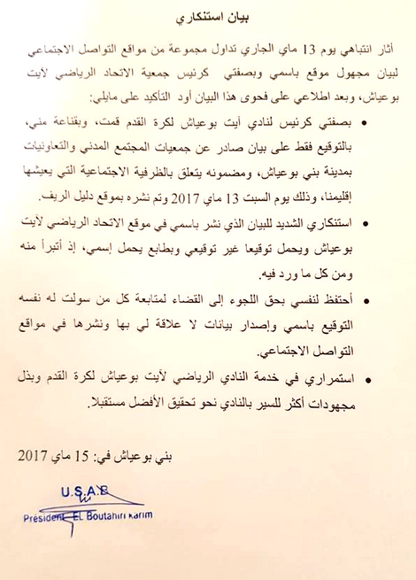 توصلت شبكة دليل الريف ببيان من رئيس جمعية اتحاد ايت بوعياش لكرة القدم ، يعبر فيه عن استنكاره لتوقيع بيان باسمه لم يطلع على مضمونه، ضد البيان الذي اصدرته الجمعيات المدنية والتعاونيات حول الوضعية التي يعيشها الاقليم.