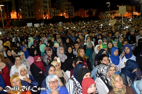 وفي الساحة الكبرى وسط الحسيمة، التئم الآلاف من المحتجين ايذاناً بانطلاق المسيرة الاحتجاجية، وعلى وقع شعارات الحراك المعهودة تحركت هذه الآلاف من الحشود التي تقدمتها النساء، في مسيرة غير مسبوقة جابت عدة شوارع قبل أن تعود الى مكان الانطلاق، على وقع شعارات تنشد الحرية والكرامة والعادلة وتُطالب برفه التهميش و "الحصار الاقتصادي" و "العسكرة"، وشعارات تُطالب بإطلاق سراح المعتقلين عى خلفية أحداث 26 مارس الماضي بامزورن.