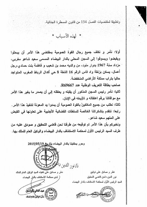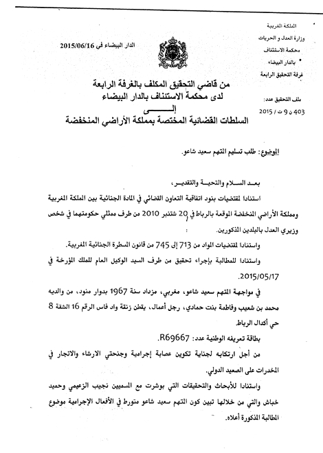 كما نشرت ذات الصحيفة نسخة من مراسلة قاضي التحقيق بمحكمة الاستئناف بالدار البيضاء، للسلطات القضائية الهولندية بسأن تسليم سعيد شعو.