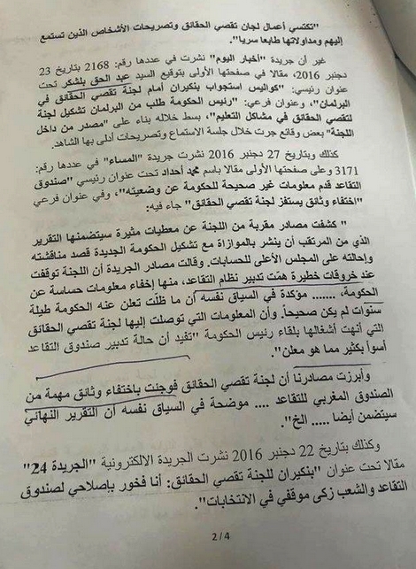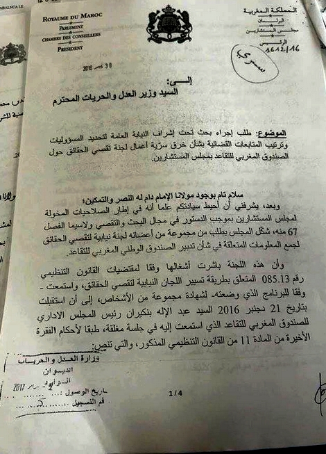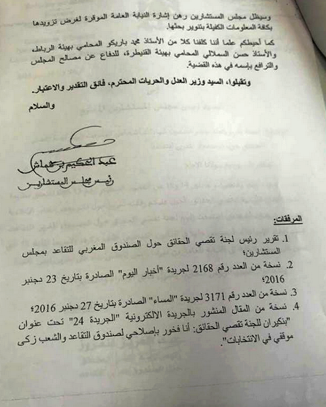 كشف محمد احداد الصحافي بجريدة المساء ، عن وثيقة تؤكد مسؤولية حكيم بنشماش رئيس مجلس المستشارين، على الدعوى القضائية الموجهة ضده في اطار ما يعرف اعلاميا "بتسريبات لجنة تقصي الحقائق حول الصندوق المغربي للتقاعد.