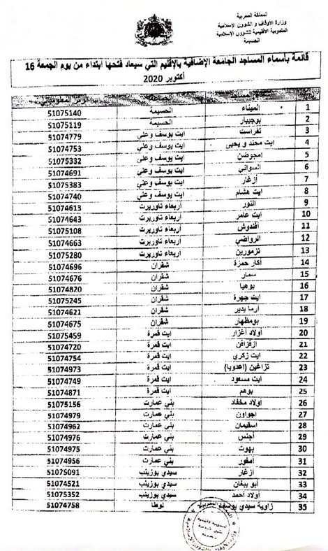 كشفت المندوبية الاقليمية للشؤون الاسلامية باقليم الحسيمة، عن لائحة المساجد الجامعة الاضافية التي سيعاد فتحها بالاقليم، ابتداء من يوم الجمعة 16 اكتوبر الجاري، في اطار تخفيف اجراءات مواجهة تفشي فيروس كورونا.