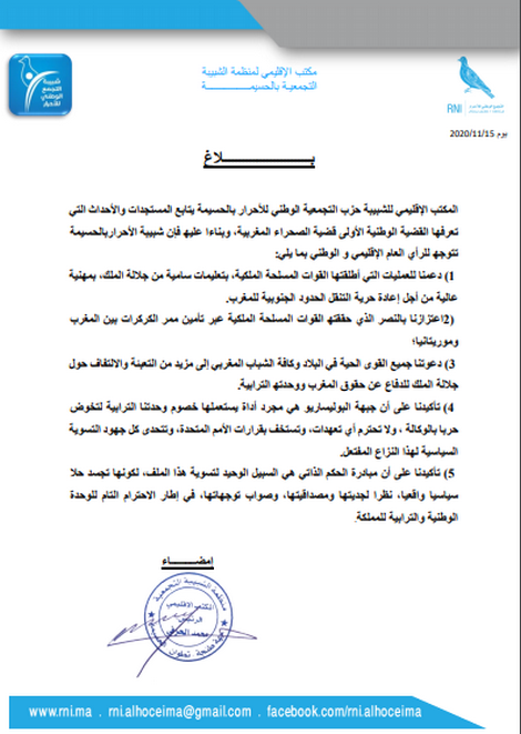 عبر المكتب الإقليمي للشبيبة حزب التجمعية الوطني للأحرار بالحسيمة، عن دعمه "للعمليات التي أطلقتها القوات المسلحة الملكية، بتعليمات سامية من جلالة الملك، بمهنية عالية من أجل إعادة حرية التنقل الحدود الجنوبية للمغرب".