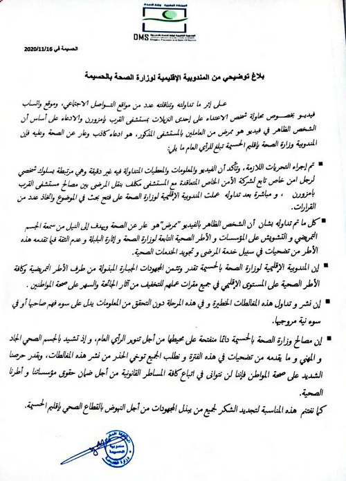 وأكدت المندوبية ان كل ما تم تداوله ان الشخص الظاهر في الفيديو "ممرض" هو عار من الصحة ويهدف النيل من سمعة الجسم التمريضي والتشويش على المؤسسات والأطر الصحية التابعة لوزارة الصحة وإثارة البلبلة وعدم الثقة فيما تقدمه هذه الاطر من تضحيات في سبيل خدمة المرضى وتجويد الخدمات الصحية".