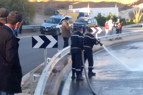 ومباشرة بعد إشعارها بالأمر سارعت السلطات المحلية ومصالح الدرك الملكي، الى عين المكان حيث تم وضع علامات تشوير لتنبيه السائقين الى وجود خطر الانزلاق، كما تم الاتصال بمصالح الوقاية المدينة التي حلت بعين المكان من اجل تنظيف الطريق بالماء، مع تغطية البقعة الزيتية بالرمل لمنع الانزلاق.