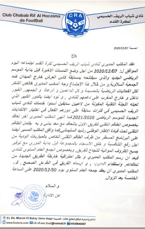 هذا و حدد المكتب المسير لفريق شباب الريف الحسمي يوم 30 دجنبر الجاري موعدا لعقد الجمع العام السنوي على الساعة الخامسة بعد الزوال دون تحديد مكان انعقاده.