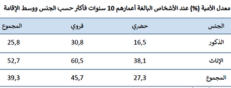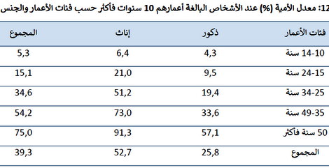 واشار تقرير المندوبية السامية للتخطيط، الى ان معدلات الأمية عند الأشخاص البالغة أعمارهم 10 سنوات فأكثر حسب فئات الأعمار والجنس منخفضة نسبيا، في صفوف فئات الأعمار بين 10 و 14 سنة، اذ لا تتجاوز 5.3 في المائة، وتبدأ في الارتفاع في الفئات السنية الأكبر لتبلغ اقصاها في فئات الاعمار التي تفوق 50 سنة، حيث بلغت 75 في المائة، اما حسب الجنس فتبقى النسبة المسجلة في صفوف النساء تقارب ضعف تلك المسجلة في صفوف الذكور وفي جميع الاعمار.