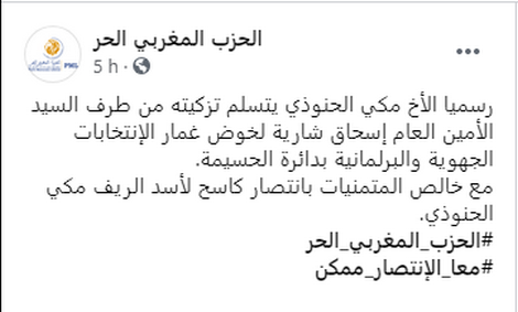 أعلن الحزب المغربي الحر، عن منح تزكية قيادة لائحة الحزب للانتخابات التشريعية باقليم الحسيمة، لمكي الحنودي رئيس جماعة لوطا.