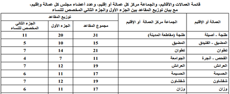 وبناء على ذلك، تقرر رسميا تقليص عدد مقاعد جماعة مدينة الحسيمة إلى 31 مقعد عوض 35 سابقا، مع تخصيص 11 مقعدا للنساء، فيما تم تخصيص 6 مقاعد بمجلس عمالة الحسيمة للنساء من اصل 17 مقعدا المخصص للمجلس.