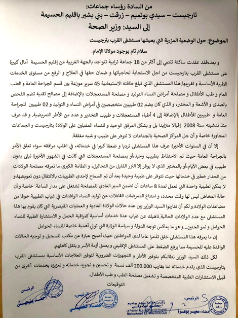 وطالب رؤساء الجماعات الموقعين على الرسالة، من وزير الصحة والتضامن الاجتماعي، بتوفر الاطر الطبية والتجهيزات الضرورية بمستشفى القرب بتارجيت، والذي يقدم خدماته لما يقرب 200 الف نسمة، وتحسين وتجويد خدماته وتعزيزه بخدمات اخرى من قبيل الاستشارات الطبية المتخصصة وتشغيل مصلحة طب الاطفال.