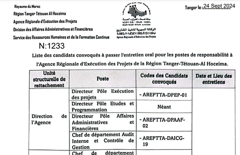 أعلنت الوكالة الجهوية لتنفيذ المشاريع بجهة طنجة تطوان الحسيمة عن تنظيم مقابلة شفوية لشغل مناصب المسؤولية داخل الوكالة، حيث تم فتح باب الترشح لعدد من المناصب الهامة، من بينها رئيس قطاع الشؤون المالية والمحاسباتية، رئيس قطاع التدقيق الداخلي ومراقبة التسيير، رئيس قطاع المشتريات والصفقات، رئيس قطاع الشؤون القانونية، رئيس قطاع الوسائل العامة، رئيس قطاع الموارد البشرية والتكوين المستمر، رئيس قطاع المسالك والتأهيل الحضري، رئيس قطاع المباني والمنشآت الفنية، رئيس قطاع التجهيزات العامة، رئيس الدراسات التقنية، رئيس قطاع الدراسات المعمارية، ورئيس قطاع نظم المعلومات.