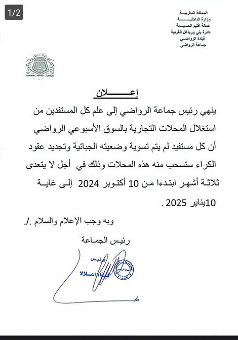 رئيس جماعة الرواضي يُمهل مستغلي المحلات التجارية بالسوق الأسبوعي ثلاثة أشهر لتسوية وضعياتهم الجبائية