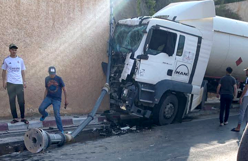 وحسب مصادر محلية، فإن الشاحنة كانت تسير بسرعة قبل أن تنحرف بشكل مفاجئ وتصطدم بحاجز إسمنتي، حيث لحقت أضرار كبيرة بمقدمة المركبة، بينما نجا الجزء الخلفي الذي يحتوي على المواد القابلة للاشتعال من التأثر المباشر، وهو ما حال دون وقوع انفجار او اشتعال النيران.