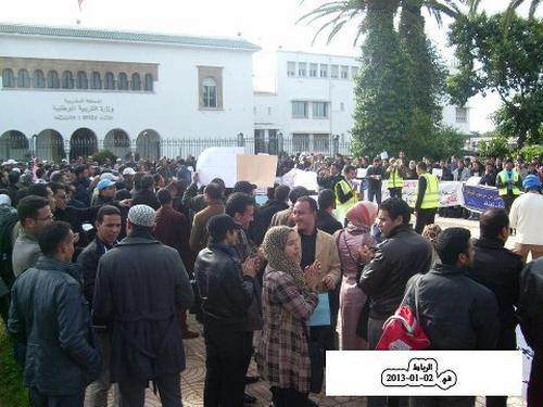 لبى الأساتذة المجازون المقصيون من مرسوم الترقية بالشهادات نداء تنسيقيتهم وحضروا بكثافة من كافة ربوع المغرب لوقفة "العزة والكرامة" صبيحة اليوم الأربعاء 2 يناير 2013 أمام مقر الوزارة بباب الرواح بالرباط .