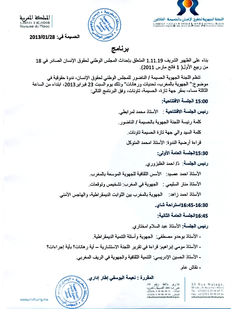 تنظم اللجنة الجهوية الحسيمة / الناظور للمجلس الوطني لحقوق الانسان يوم السبت 23 فبراير ندوة حقوقة تحت عنوان " الجهوية بالمغرب ..تحديات ورهانات" بمقر جهة تازة الحسيمة تاونات .