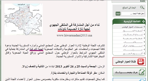 بعد تاجيل اشغال اللقاء الجهوي السادس في اطار الحوار الوطني حول المجتمع المدني والادوار الدستورية الجديدة الذي كان من المقرر تنظيمه بالحسيمة يوم 14 سبتمبر الماضي قررت اللجنة تغيير مكان انعقاد هذا اللقاء وتمت برمجته في بمدينة تازة يوم 25 و 26 من شهر اكتوبر الجاري ابتداء من الثانية والنصف زولا بمقر غرفة الصناعة والتجارة والخدمات بتازة.