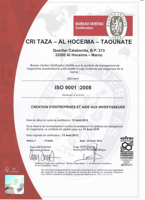 انعقد يوم الخميس 21 نونبر 2013 بمقر المركز الجهوي للإستثمار لجهة تازة الحسيمة تاونات حفل تسليم شهادة الجودة إيزو ISO 9001 version 2008 لهذا الأخير ولملحقته بمدينة تازة، من طرف المكتب المكلف بالإشهاد على جودة الخدمات المقدمة (Bureau Veritas)، وهو الحفل الذي تزامن مع الاحتفاء بمرور إحدى عشر سنة على الرسالة الملكية الموجهة للسيد الوزير الأول بتاريخ 9 يناير 2002، في موضوع التدبير اللامتمركز للإستثمار.
