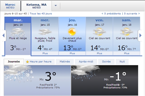 وبخصوص اقليم الحسيمة يتوقع ان يعرف تساقطات متفرقة يوم السبت فيما يتوقع يومي الاثنين والثلاثاء تساقط كمية مهمة من الامطار مصحوبة بثلوج على مرتفعات منطقة كتامة واساكن مع تدني لدرجة الحرار التي ستسجل درجة تحت الصفر .