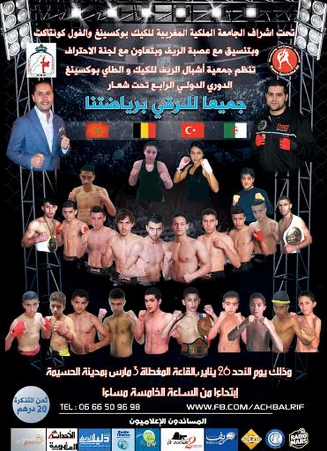 تحت شعار » جميعا للرقي برياضتنا»، وتحت إشراف الجامعة الملكية المغربية للكيك بوكسينغ والرياضات المشابهة وبتنسيق مع عصبة الريف، وبتعاون مع لجنة الاحتراف تنضم جمعية أشبال الريف التظاهرة الدولية الرابعة للطاي بوكسينغ وذلك يوم الاحد 26-01-2014 ابتداء من الساعة الخامسة مساءا بمشاركة دول بلجيكا تركيا الجزائر والمغرب خاصة أبطال نخبة الريف وتهدف هده التظاهرة إلى الرفع بمستوى ابطال مدينة الحسيمة باحتكاكهم بأبطال الديار الاوروبية والجارة الجزائر