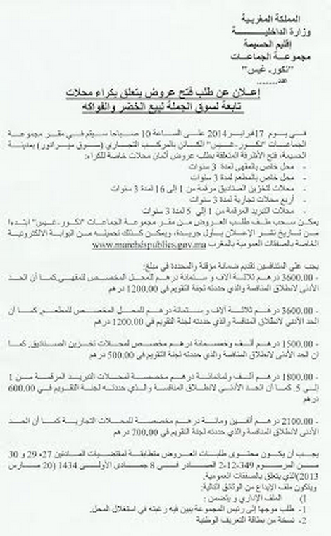 اعلان عن طلب عروض يتعلق بكراء محلات بسوق الجملة بأيت يوسف أعلي