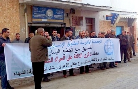 بمناسبة الذكرى الثالثة لانطلاقة حركة 20 فبراير، نظم فرع الحسيمة للجمعية المغربية لحقوق الإنسان وبتنسيق مع تجمع اليسار يوم الاحد 23 فبراير الجاري، ابتداء من الساعة الرابعة بعد الزوال، وقفة احتجاجية امام مقره بشارع وادي المخازن رقم 27 المطل على شارع محمد الخامس والتي توجت بمائدة مستديرة تحت شعار: ثلاث سنوات على أحداث 20 فبراير بالحسيمة ، وسؤال ماذا جرى؟