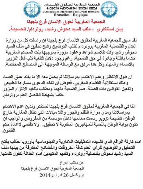 توصلت شبكة دليل الريف ببيان من فرع بلجيكا للجمعية المغر بية لحقوق الانسان يتسنكر فيه عدم اهتمام السلطات المغربية بالمراسلات التي بعثها الفرع حول مجموعة من الملفات ومنها ملف السيد دحوش رشيد المهاجر المغربي وهو مهاجر مغربي اصبح متهما بناء على عقد مزور مصادق عليه بالقنصلية المغربية بروتردام الهولندية .