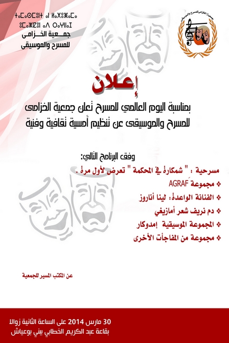 بمناسبة اليوم العالمي للمسرح تنظم جمعية الخزامى للمسرح و الموسيقى امسية ثقافية وفنية وذلك يوم الاحد 30 مارس 2014 على الساعة الثانية زوالا بقاعة محمد بن عبد الكريم الخطابي.