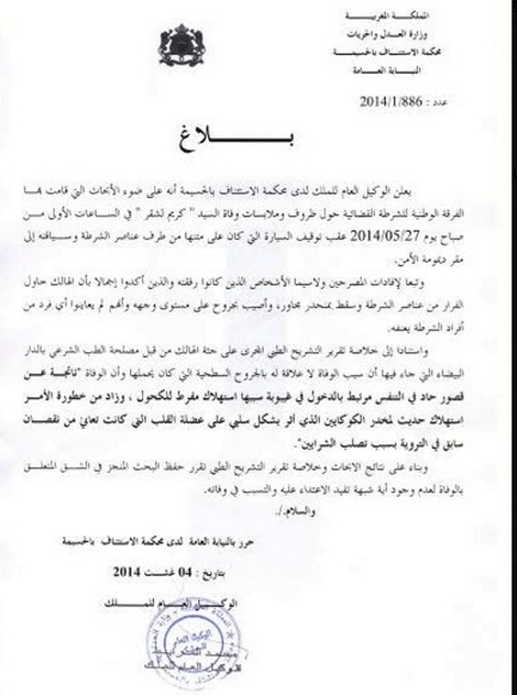 وأوضح بلاغ للوكيل العام للملك لدى محكمة الاستئناف بالحسيمة أن ذلك جاء على ضوء الأبحاث التي قامت بها الفرقة الوطنية للشرطة القضائية حول ظروف وملابسات وفاة السيد "كريم لشقر" في الساعات الأولى من صباح يوم 27 ماي الماضي، عقب توقيف السيارة التي كان على متنها من طرف عناصر الشرطة وسياقته إلى مقر ديمومة الأمن.