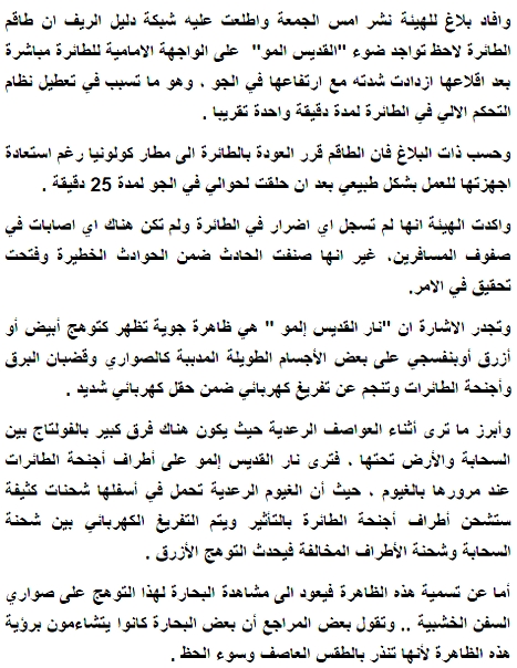 كشفت هيئة الطيران الالمانية عن تفاصيل اصابة طائرة من نوع ايرباص بـ "نار القديس المو" بعد ان اقلعت من مطار كولونيا في اتجاه مطار العروي (الناظور) في 8 ابريل الماضي مما تسبب في تعطيل الاجهزة الالكترونية للطائرة بشكل مؤقت.